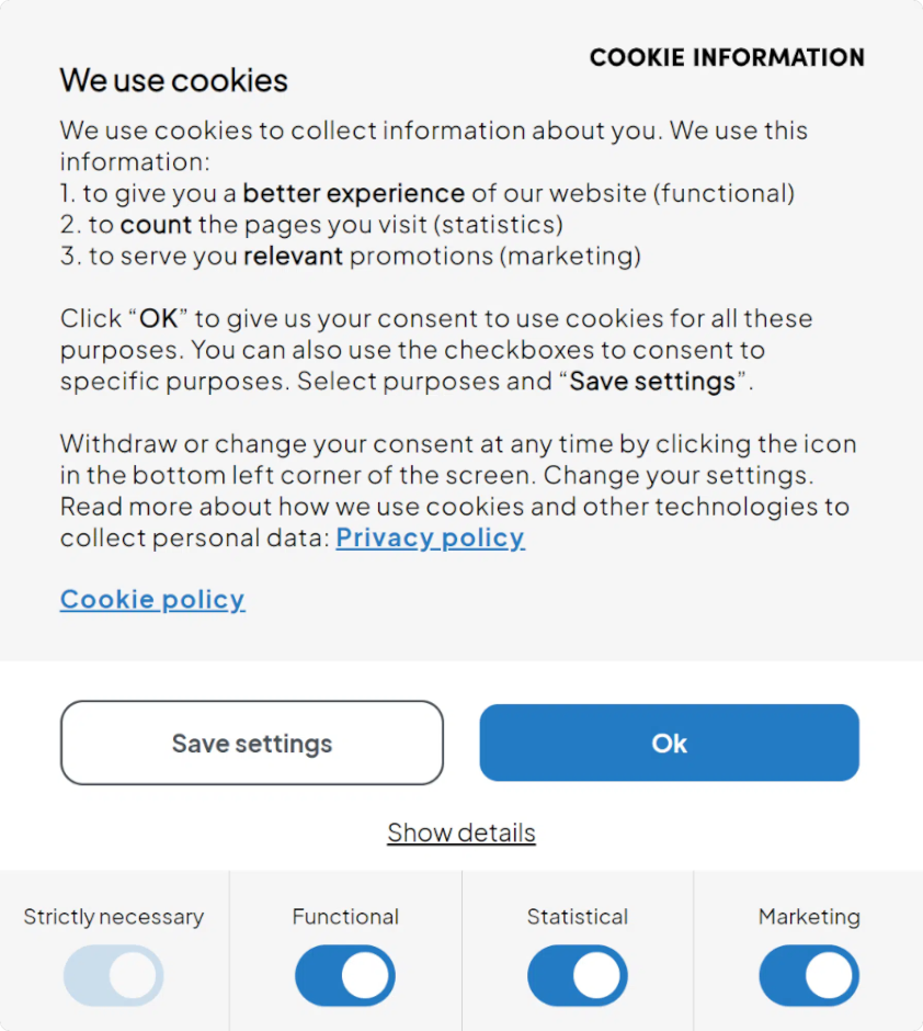 Men faktisk skal et cookiebanner ikke kun betragtes som information om cookies. Det skal betragtes som en samtykke-pop-up.