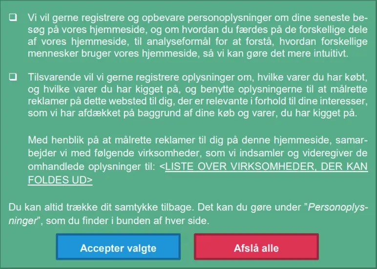 Datatilsynet har i sin vejledning “Behandling af oplysninger om hjemmesidebesøgende” lavet et eksempel for, hvordan et gyldigt samtykkebanner kan se ud: