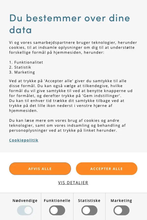 Men når du har en flot og lækker hjemmeside, vil du måske også gerne have et flot og lækkert cookiebanner. Vi har valgt at designe vores sådan her. Det er gyldigt i forhold til Datatilsynets vejledning og GDPR.