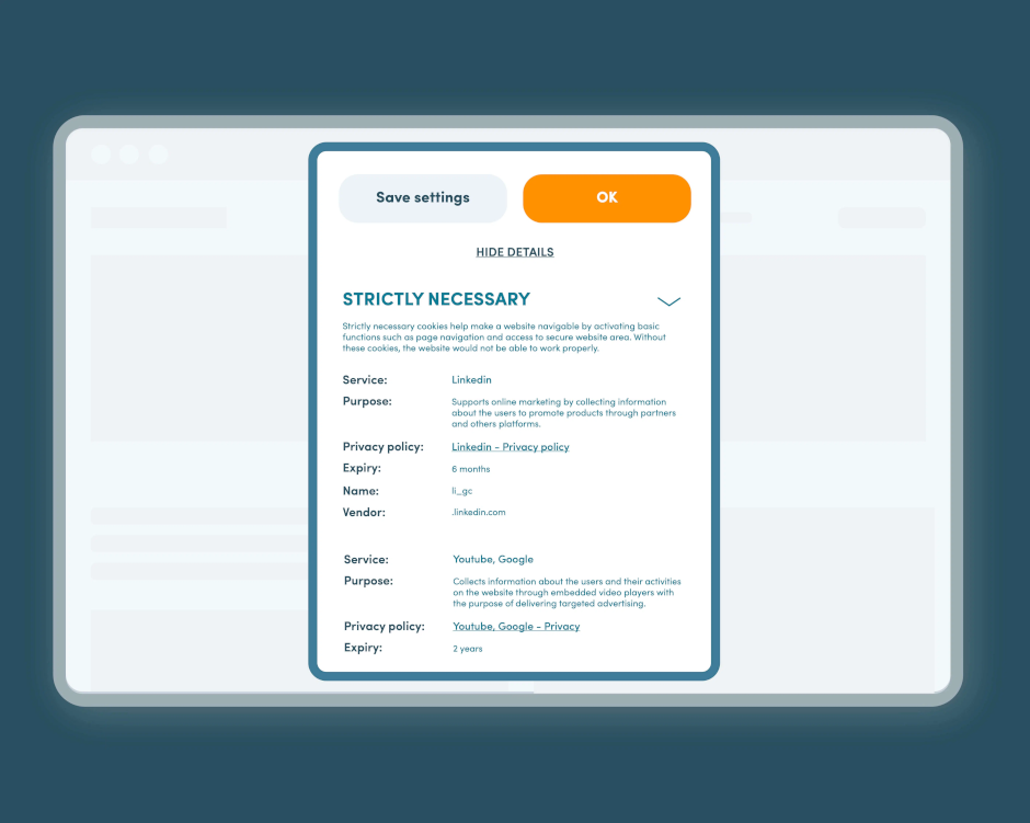 Hyvä Suostumustenhallinta-alusta tekee sinulle automaattisesti päivitetyn version evästekuvauksesta, ja sisällyttää sen evästebanneriisi.