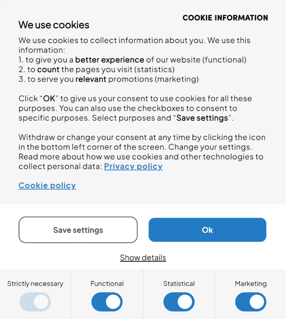 For det første er de juridiske kravene for et cookie-banner ganske enkle. Et cookie-banner skal gi brukeren: