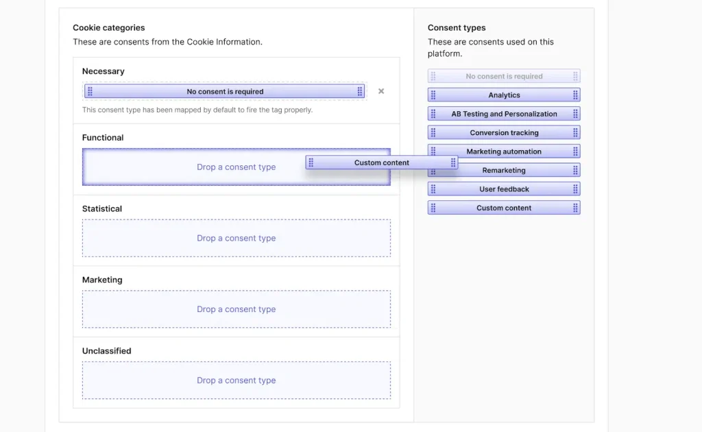 The dedicated Cookie Information tag automatically maps cookie categories from your CMP to consent types in Piwik PRO. This allows you to trigger tags in Piwik PRO Tag Manager based on consents collected via your cookie banner.