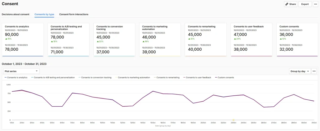 - Consents by type: Provides statistics for each consent option on your cookie banner and helps you quickly see the impact of changes in your consent collection strategy and understand overall user consent behavior.