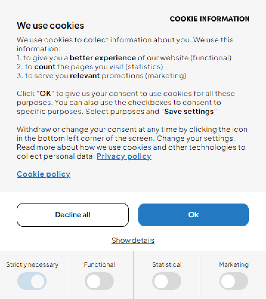 Cookie Information automatically maps the 7 consent types to the 4 different categories in the cookie consent banner that comes with Cookie Information CMP.