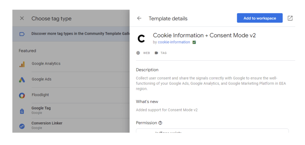 Then click on “Discover more tag types in the community template gallery”. When you get there, search for our tag template “Cookie Information Consent Mode v2”.