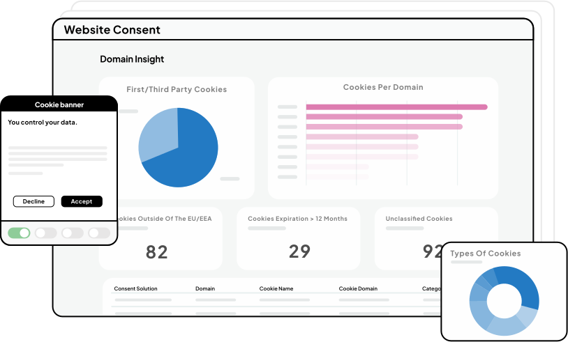 Hjälp dina kunder att implementera samtyckeshantering både på deras webbplatser (cookiebanner) och appar (samtycke för mobilappar). Dina kunder får en beprövad, anpassningsbar och intuitiv plattform för samtyckeshantering som bygger förtroende genom att respektera användarnas integritet.