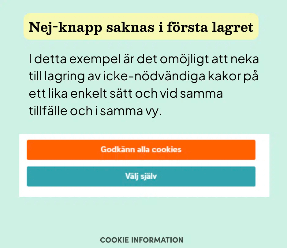 1. Du måste göra det möjligt för användare att neka till lagring av icke-nödvändiga kakor på ett lika enkelt sätt och vid samma tillfälle och i samma vy som användare gest möjlighet att lämna samtycke till behandlingen.
