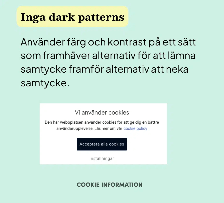 5. Det är inte tillåtet att använda färger och kontraster på ett sätt som framhäver alternativ för att lämna samtycke framför alternativ för att neka samtycke.